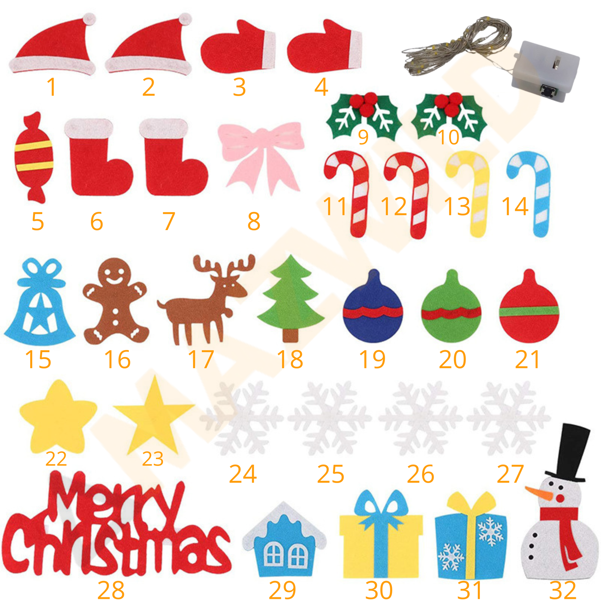 Este Árbol de Navidad de fieltro con 32 piezas + su tira de LED de 3M está diseñado para que los peques decoren, jueguen y creen su propia magia una y otra vez. Es suave, seguro y se puede colgar en la pared, puerta, ventana, etc... para evitar accidentes con árboles reales.